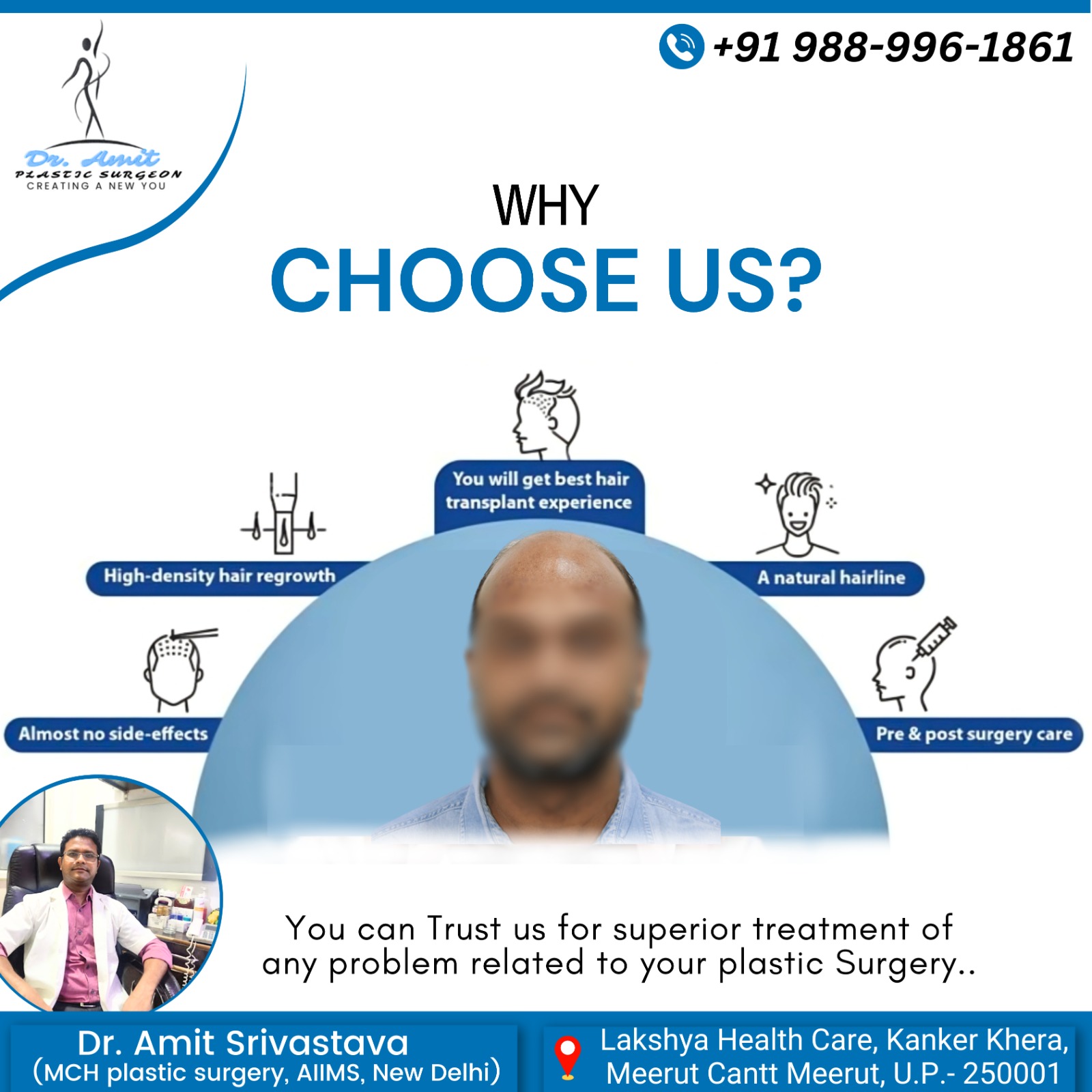 Hair loss and scalp problems can affect confidence and self-esteem. Choosing the right clinic for hair treatments is crucial. At Lakshya Health Care, Meerut, patients benefit from advanced hair care solutions provided by an “Experienced Plastic Surgeon in Meerut”. Our clinic offers personalized treatment plans for hair restoration, hair transplant, and other scalp-related procedures.